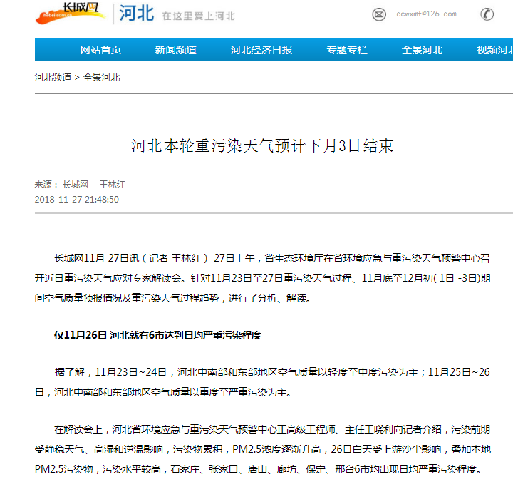 长城网11月 27日讯(记者 王林红) 27日上午,杏彩(中国)官方网站 在省环境应急与重污染天气预警中心召开近日重污染天气应对专家解读会。针对11月23日至27日重污染天气过程、11月底至12月初( 1日 -3日)期间空气质量预报情况及重污染天气过程趋势,进行了分析、解读。