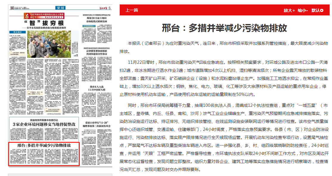 本报讯(记者邢云)为应对重污染天气,连日来,邢台市积极采取并加强系列管控措施,最大限度减少污染物排放。