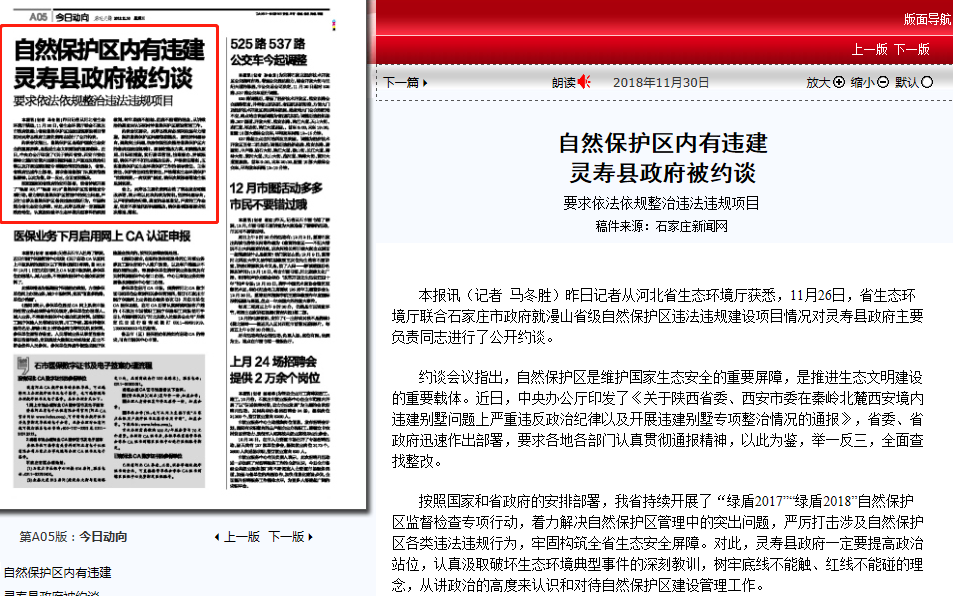 联合石家庄市政府就漫山省级自然保护区违法违规建设项目情况对灵寿县政府主要负责同志进行了公开约谈。