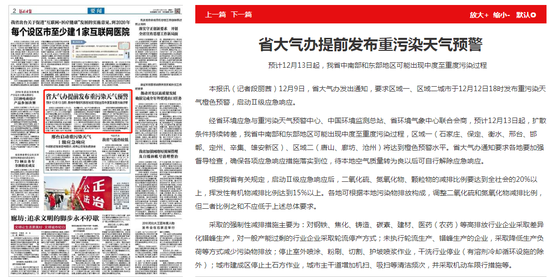 河北日报:省大气办提前发布重污染天气预警