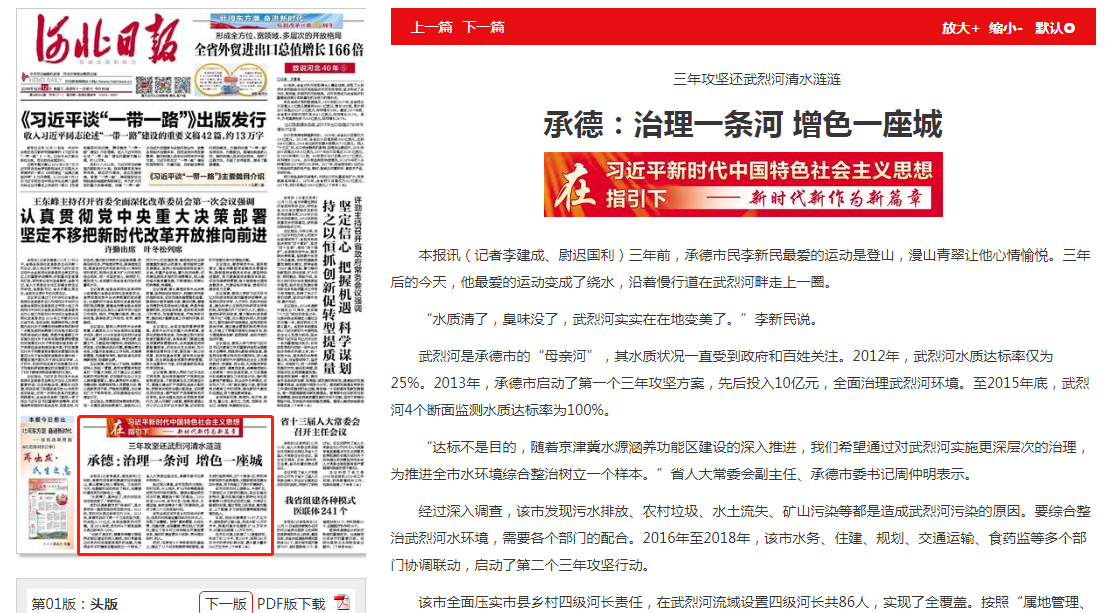 武烈河是承德市的“母亲河”,其水质状况一直受到政府和百姓关注。2012年,武烈河水质达标率仅为25%。2013年,承德市启动了第一个三年攻坚方案,先后投入10亿元,全面治理武烈河环境。至2015年底,武烈河4个断面监测水质达标率为100%。