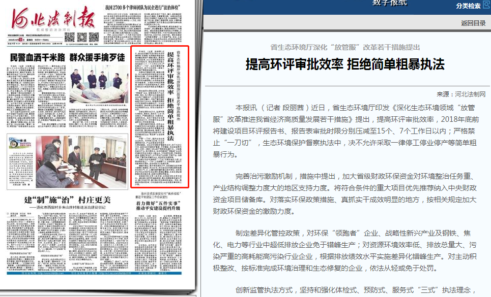 印发《深化生态环境领域“放管服”改革推进我省经济高质量发展若干措施》提出,提高环评审批效率,2018年底前将建设项目环评报告书、报告表审批时限分别压减至15个、7个工作日以内;严格禁止“一刀切”,生态环境保护督察执法中,决不允许采取一律停工停业停产等简单粗暴行为。