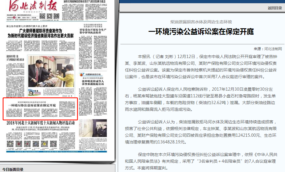河北法制报:柴油泄漏损害水体及周边生态环境 一环境污染公益诉讼案在保定开庭