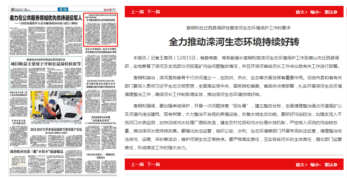 本报讯(记者王育民)12月15日,省委常委、常务副省长袁桐利就滦河生态环境保护工作到唐山市迁西县调研,实地察看了滦河及支流部分河段尾矿污染问题整改情况,并召开滦河省级河长工作会议就有关工作进行部署。