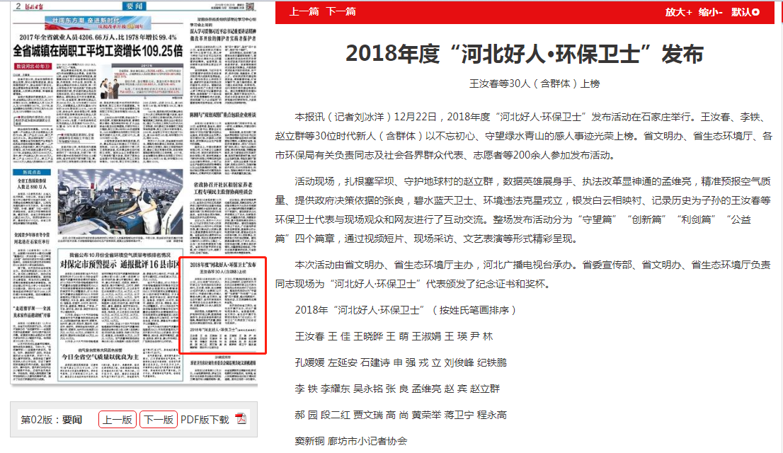 本报讯(记者刘冰洋)12月22日,2018年度“河北好人·环保卫士”发布活动在石家庄举行。王汝春、李铁、赵立群等30位时代新人(含群体)以不忘初心、守望绿水青山的感人事迹光荣上榜。省文明办、杏彩(中国)官方网站 、各市环保局有关负责同志及社会各界群众代表、志愿者等200余人参加发布活动。