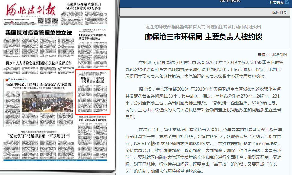 河北法制报:廊保沧三市环保局 主要负责人被约谈