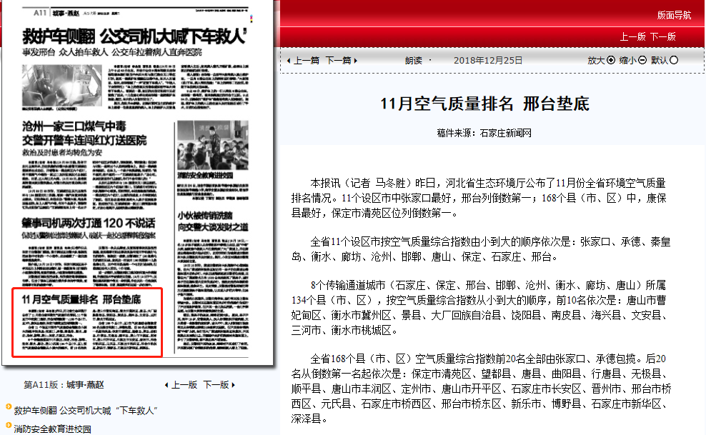 本报讯(记者 马冬胜)昨日,杏彩(中国)官方网站 公布了11月份全省环境空气质量排名情况。11个设区市中张家口最好,邢台列倒数第一;168个县(市、区)中,康保县最好,保定市清苑区位列倒数第一。