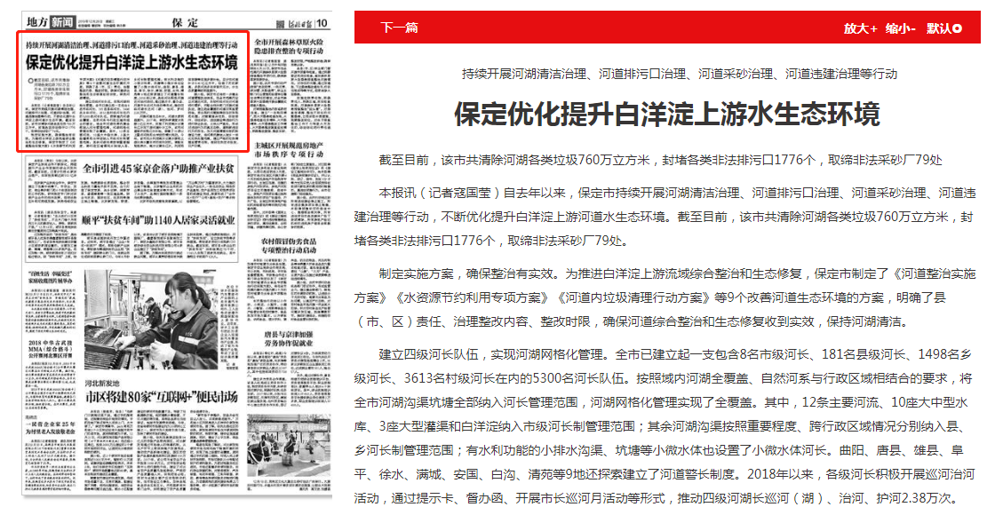 据介绍,保定市还将进一步健全河道管理执法体系,在全市范围内设立河道巡河员,协助村级河长对河道进行管护,并配合相关部门开展河道执法,建立起全覆盖的河道日常监管网络,使出现的问题能得到及时发现和处理;对随意堆弃垃圾、非法排污、非法采砂、违法建设等违法行为进行联合执法,从快从严查处,形成对违法行为的高压态势,遏制新违法行为的发生。加大河道清理长效机制建设力度,将河渠坑塘纳入城乡一体化垃圾处理范围,建立严格的垃圾清理监管责任制,做到垃圾定点投放,日产日清。
