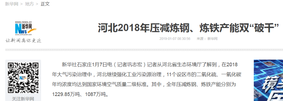 新华社:河北2018年压减炼钢、炼铁产能双“破千”