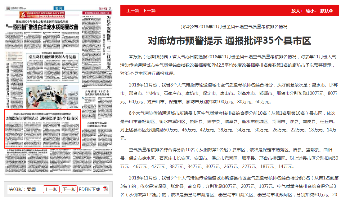河北日报:我省公布2018年11月份全省环境空气质量考核排名情况 对廊坊市预警提示 通报批评35个县市区