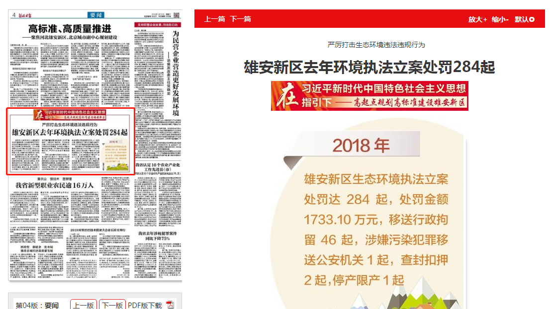 河北日报:严厉打击生态环境违法违规行为 雄安新区去年环境执法立案处罚284起