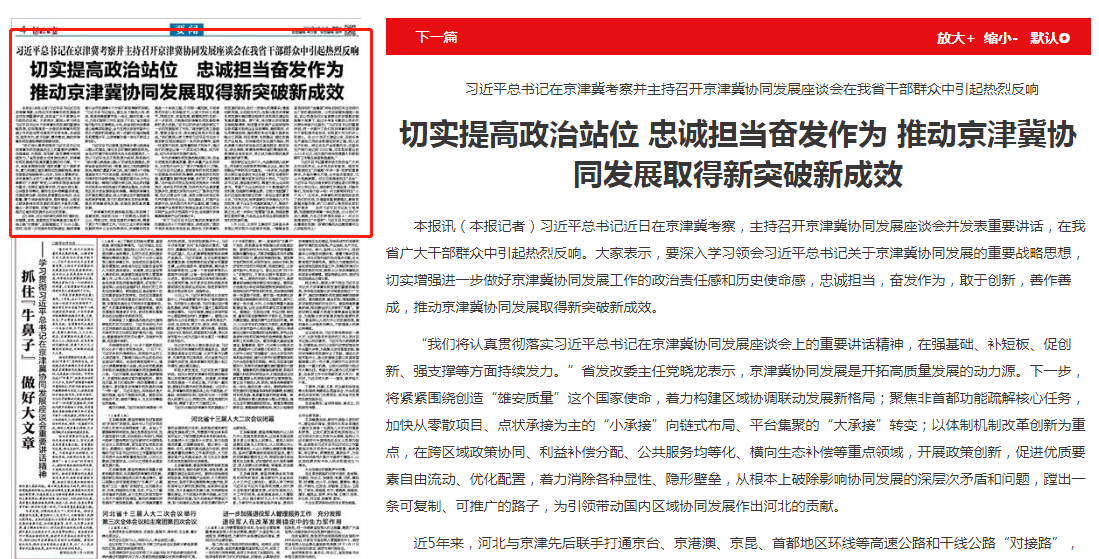 河北日报:习近平总书记在京津冀考察并主持召开京津冀协同发展座谈会在我省干部群众中引起热烈反响