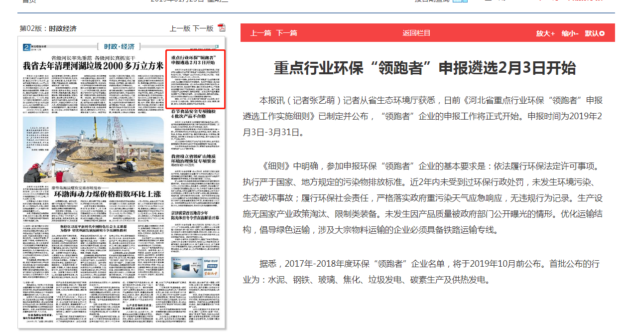 河北经济日报:重点行业环保“领跑者”申报遴选2月3日开始