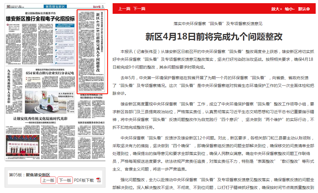 河北日报:落实中央环保督察“回头看”及专项督察反馈意见 新区4月18日前将完成九个问题整改