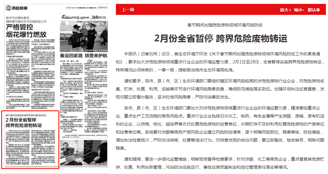 燕赵都市报:春节期间加强危险废物领域环境风险防控 2月份全省暂停 跨界危险废物转运