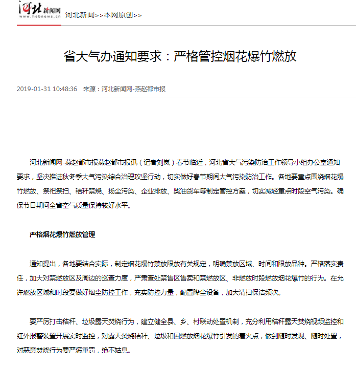 河北新闻网-燕赵都市报燕赵都市报讯(记者刘岚)春节临近,河北省大气污染防治工作领导小组办公室通知要求,坚决推进秋冬季大气污染综合治理攻坚行动,切实做好春节期间大气污染防治工作。各地要重点围绕烟花爆竹燃放、祭祀祭扫、秸秆禁烧、扬尘污染、企业排放、柴油货车等制定管控方案,切实减轻重点时段空气污染。确保节日期间全省空气质量保持较好水平。