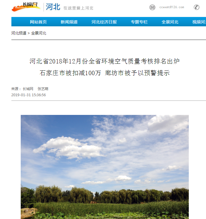 长城网:河北省2018年12月份全省环境空气质量考核排名出炉 石家庄市被扣减100万 廊坊市被予以预警提示