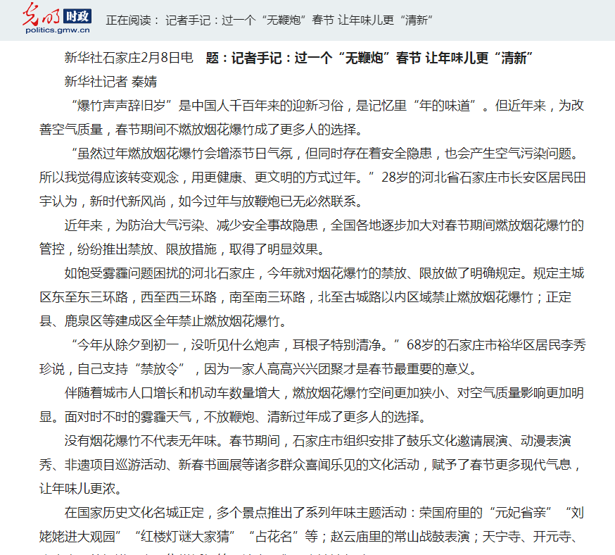 新华社:过一个“无鞭炮”春节 让年味儿更“清新”