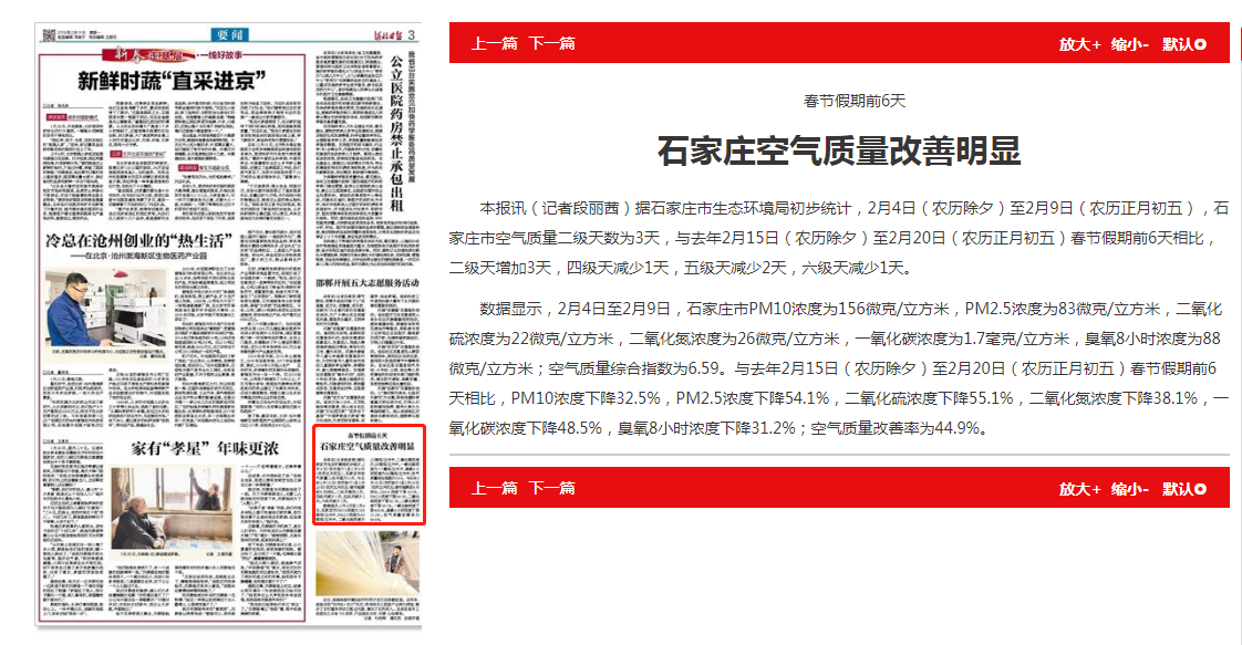 河北日报:春节假期前6天 石家庄空气质量改善明显