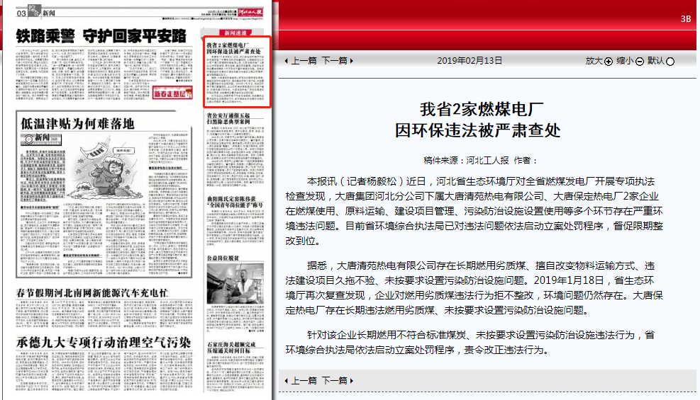 河北工人报:我省2家燃煤电厂因环保违法被严肃查处 来源:省生态环境宣传教育中心 时间:2019-02-13