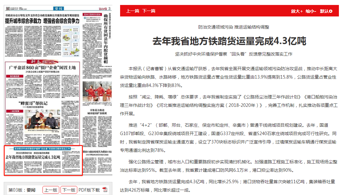 河北日报:防治交通领域污染 推进运输结构调整 去年我省地方铁路货运量完成4.3亿吨