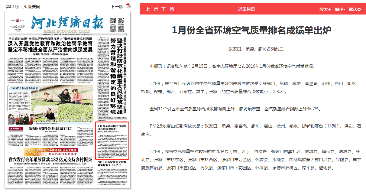 1月份,在全省11个设区市中空气质量由好到差顺序依次是:张家口、承德、廊坊、秦皇岛、沧州、唐山、衡水、邯郸、保定、邢台、石家庄。其中,张家口的空气质量综合指数最小,为3.25。