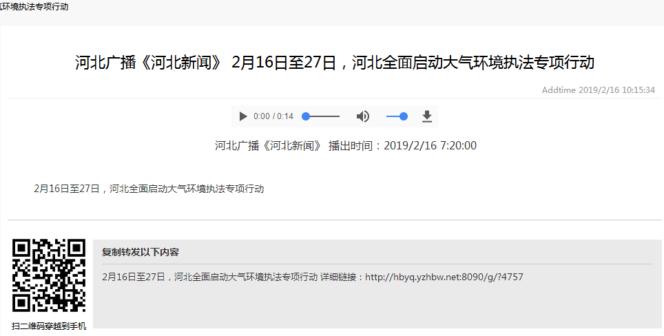 河北综合广播《河北新闻》:2月16日至27日,河北全面启动大气环境执法专项行动