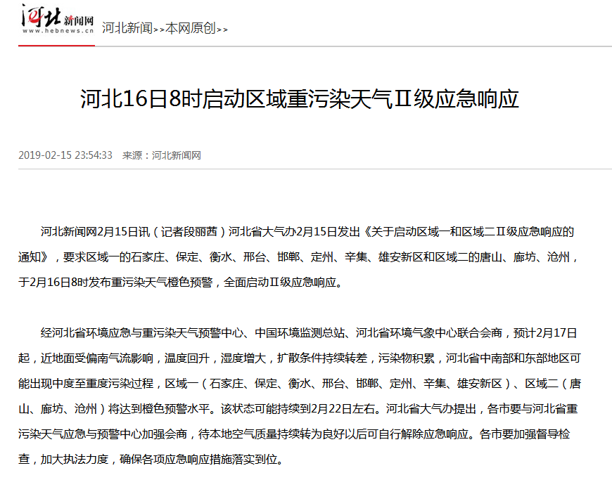 河北新闻网:河北16日8时启动区域重污染天气Ⅱ级应急响应