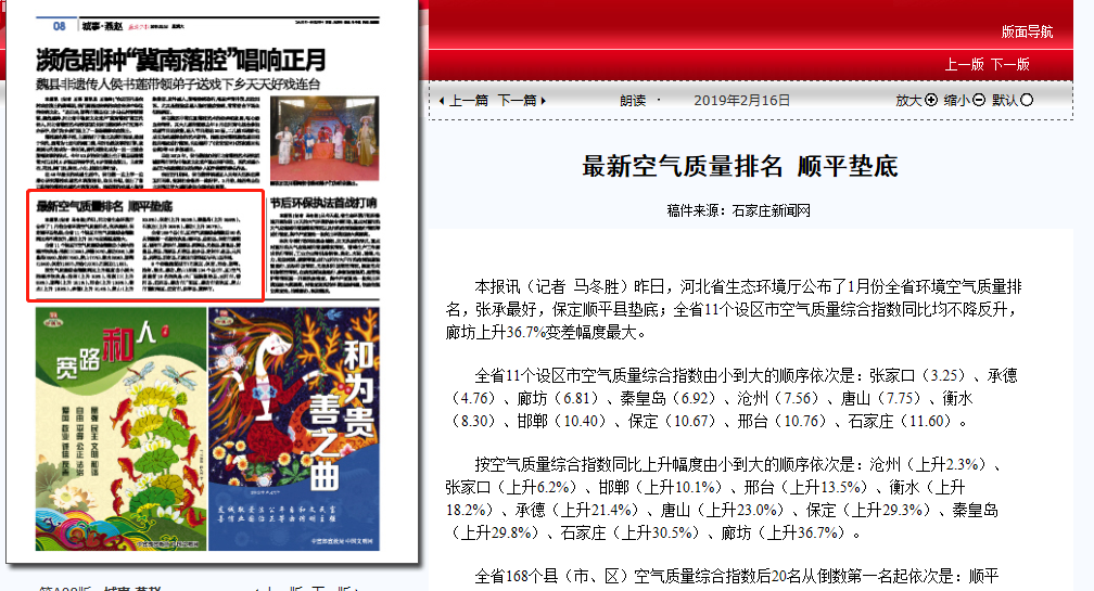 公布了1月份全省环境空气质量排名,张承最好,保定顺平县垫底;全省11个设区市空气质量综合指数同比均不降反升,廊坊上升36.7%变差幅度最大。 全省11个设区市空气质量综合指数由小到大的顺序依次是:张家口(3.25)、承德(4.76)、廊坊(6.81)、秦皇岛(6.92)、沧州(7.56)、唐山(7.75)、衡水(8.30)、邯郸(10.40)、保定(10.67)、邢台(10.76)、石家庄(11.60)。 按空气质量综合指数同比上升幅度由小到大的顺序依次是:沧州(上升2.3%)、张家口(上升6.2%)、邯郸(上升10.1%)、邢台(上升13.5%)、衡水(上升18.2%)、承德(上升21.4%)、唐山(上升23.0%)、保定(上升29.3%)、秦皇岛(上升29.8%)、石家庄(上升30.5%)、廊坊(上升36.7%)。 全省168个县(市、区)空气质量综合指数后20名从倒数第一名起依次是:顺平县、曲阳县、保定市清苑区、晋州市、新乐市、望都县、深泽县、无极县、高邑县、赞皇县、唐县、博野县、行唐县、柏乡县、定州市、赵县、元氏县、灵寿县、正定县、石家庄市新华区与平山县并列。 8个传输通道城市(石家庄、保定、邢台、邯郸、沧州、衡水、廊坊、唐山)所属134个县(市、区)空气质量前10名依次是:大厂回族自治县、三河市、香河县、迁西县、廊坊市广阳区、廊坊市安次区、唐山市曹妃甸区、迁安市、乐亭县、黄骅市。