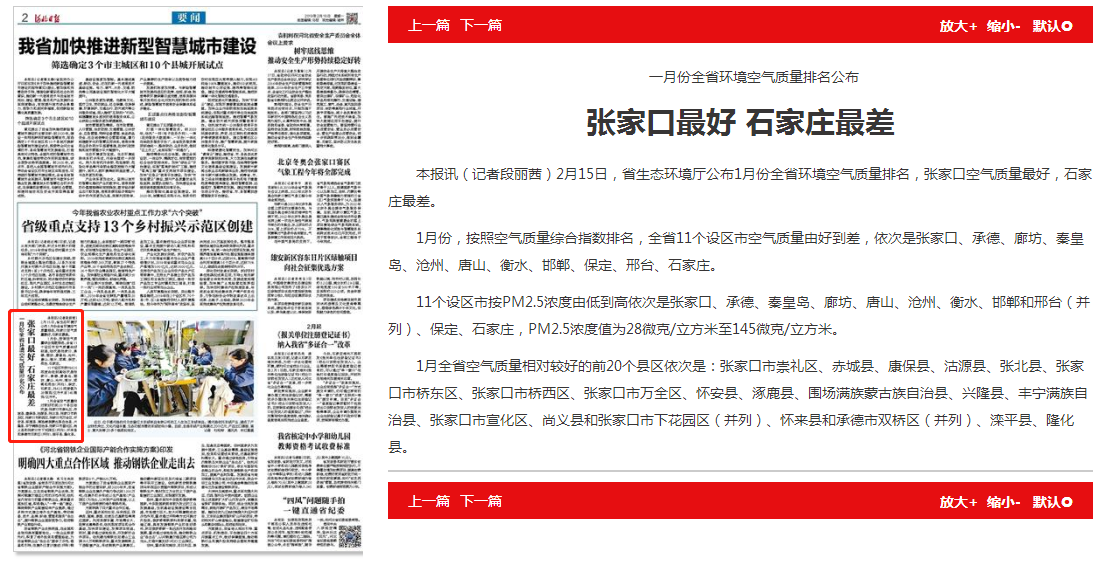 本报讯(记者段丽茜)2月15日,杏彩(中国)官方网站 公布1月份全省环境空气质量排名,张家口空气质量最好,石家庄最差。