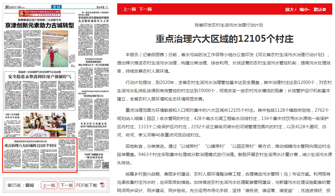 河北日报:我省印发农村生活污水治理行动计划 重点治理六大区域的12105个村庄