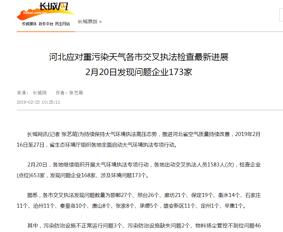 长城网讯(记者 张艺萌)为持续保持大气环境执法高压态势,推进河北省空气质量持续改善,2019年2月16日至27日,杏彩(中国)官方网站 组织各地全面启动大气环境执法专项行动。