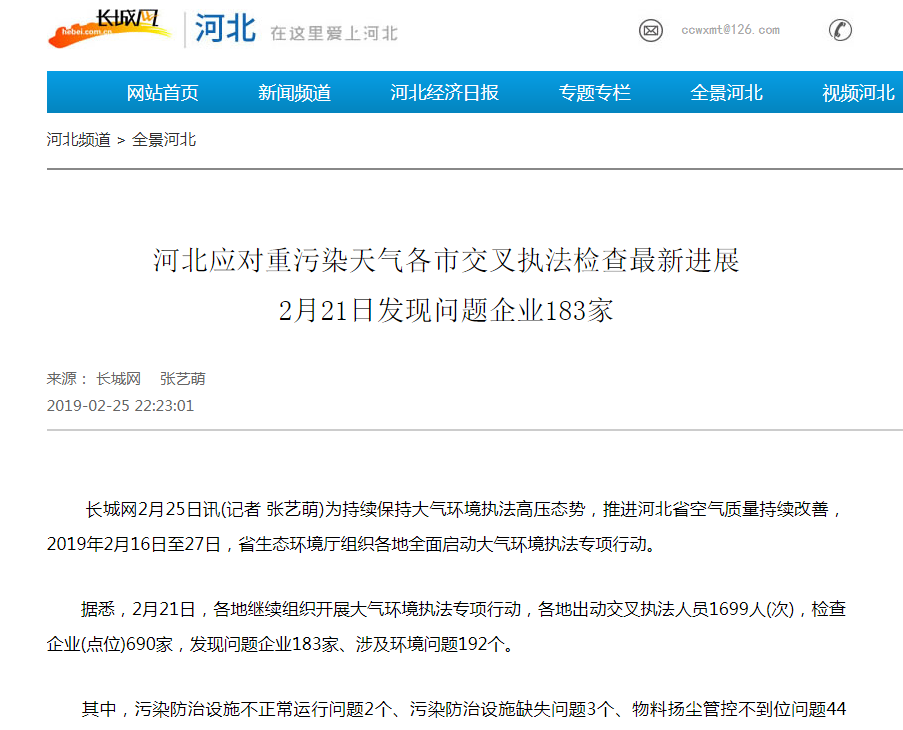 长城网2月25日讯(记者 张艺萌)为持续保持大气环境执法高压态势,推进河北省空气质量持续改善,2019年2月16日至27日,杏彩(中国)官方网站 组织各地全面启动大气环境执法专项行动。