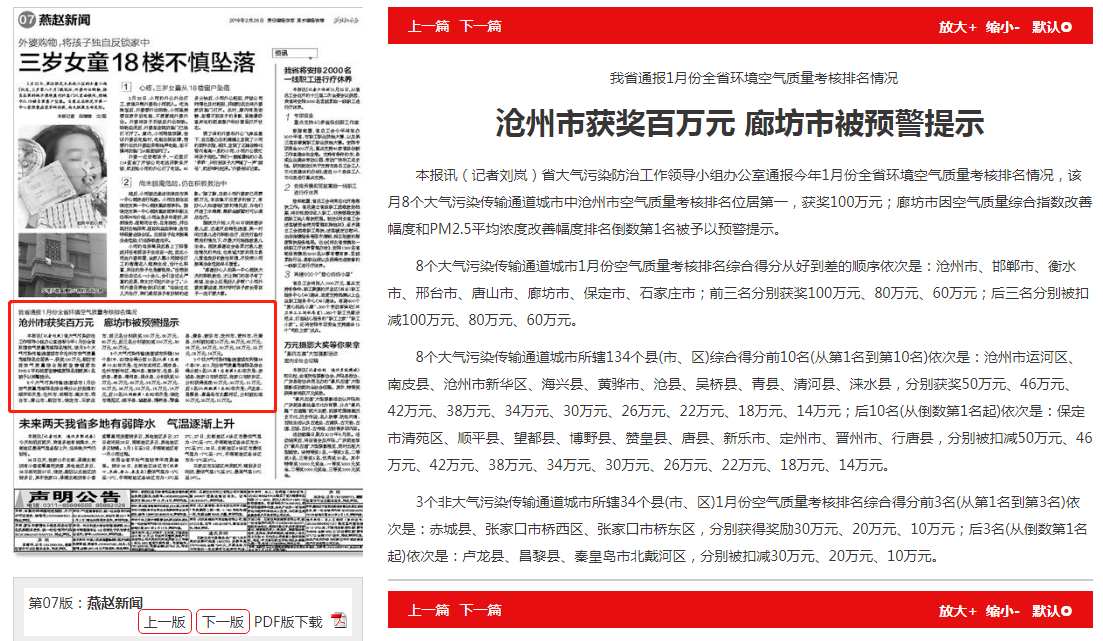 燕赵都市报:沧州市获奖百万元 廊坊市被预警提示