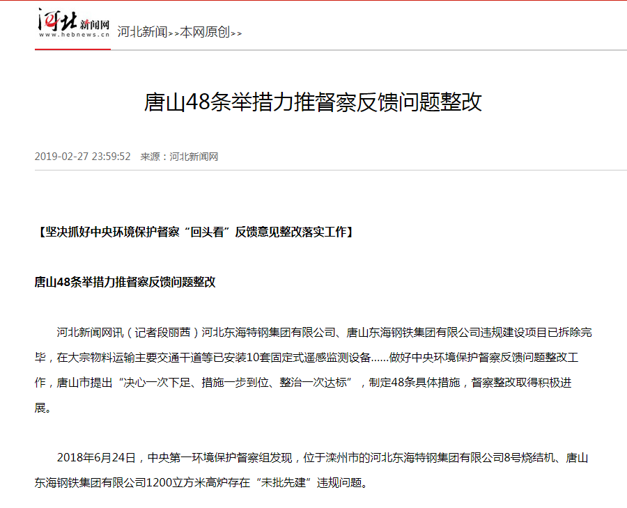 2018年6月24日,中央第一环境保护督察组发现,位于滦州市的河北东海特钢集团有限公司8号烧结机、唐山东海钢铁集团有限公司1200立方米高炉存在“未批先建”违规问题。