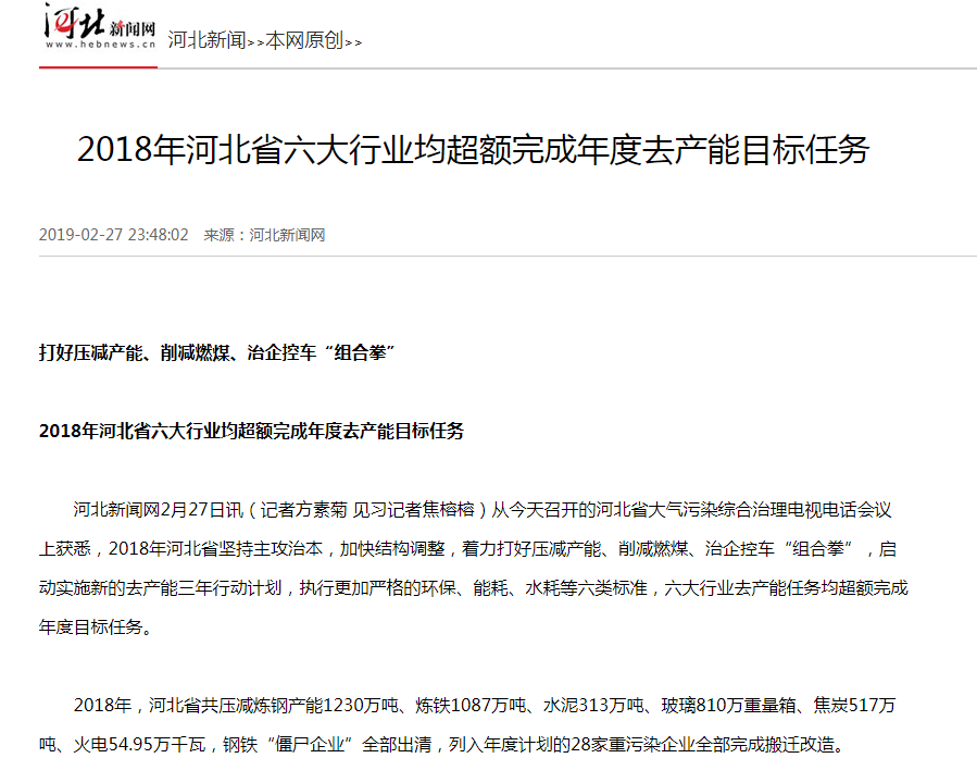 2018年河北省六大行业均超额完成年度去产能目标任务