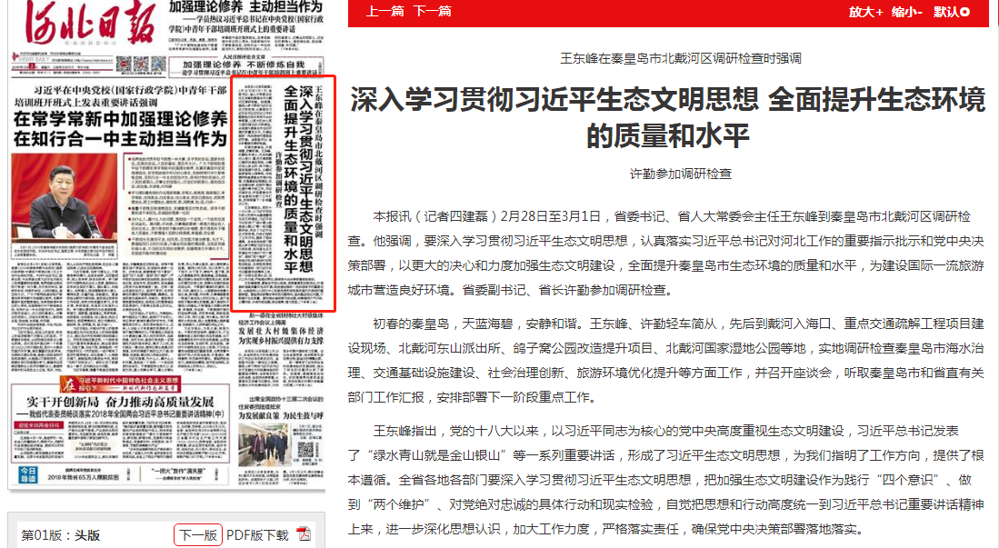 河北日报:深入学习贯彻习近平生态文明思想 全面提升生态环境的质量和水平