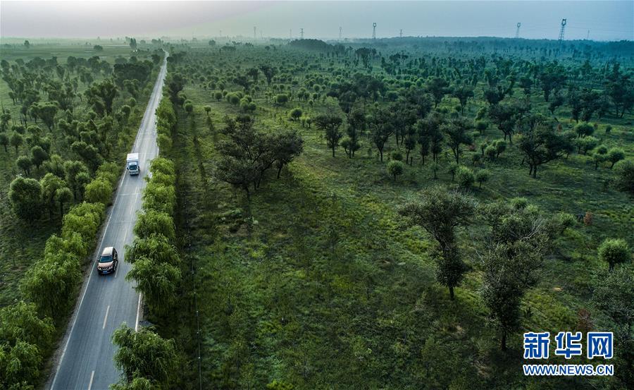 汽车行驶在陕西省榆林市靖边县东坑镇新建村的道路上(2018年8月1日无人机拍摄)。陕西省开展的天然林保护工程和全面治理荒沙行动,极大改善了毛乌素的生态环境,也使沙漠南缘的陕西省榆林市实现从“沙进人退”到“绿进沙退”的转变。 新华社记者 陶明 摄