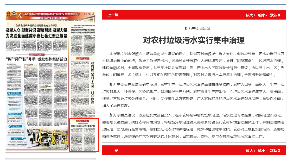 本报讯(记者张淑会)随着美丽乡村建设的推进,我省农村面貌发生很大变化,但垃圾处理、污水治理仍是农村环境治理中的短板。政府工作报告提出,因地制宜开展农村人居环境整治,推进“厕所革命”、垃圾污水治理,建设美丽乡村。全国政协委员,九三学社河北省委副主委、唐山市人民医院院长胡万宁建议,应以县(市、区)为单位,明确县、乡(镇)、村以及相关部门的职责范围,对农村垃圾污水实行集中治理,全面提升治理能力。