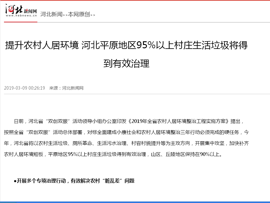 河北新闻网:提升农村人居环境 河北平原地区95%以上村庄生活垃圾将得到有效治理