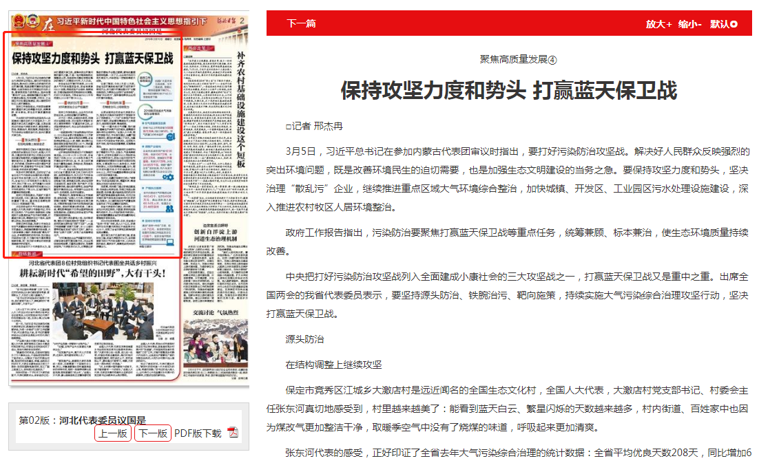张东河代表的感受,正好印证了全省去年大气污染综合治理的统计数据:全省平均优良天数208天,同比增加6天。全省PM2.5平均浓度为56微克/立方米,同比下降14%,空气质量为6年来最好。衡水、邯郸和保定市的年度PM2.5平均浓度同比下降20%,区域环境空气质量得到持续改善。