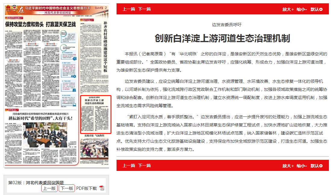 边发吉委员建议,应设立统筹白洋淀上游河道治理、水资源管理、水环境改善、水生态修复一体化的领导机构,以河湖长制为依托,强化流域跨行政区党政联合工作机制和部门联动机制,加强各领域政策措施之间的统筹协调和综合配套。创新白洋淀上游河道生态治理机制,建立水资源统一调配制度,改进上游水库调度运用机制,加强全流域生态需求风险统筹管理。