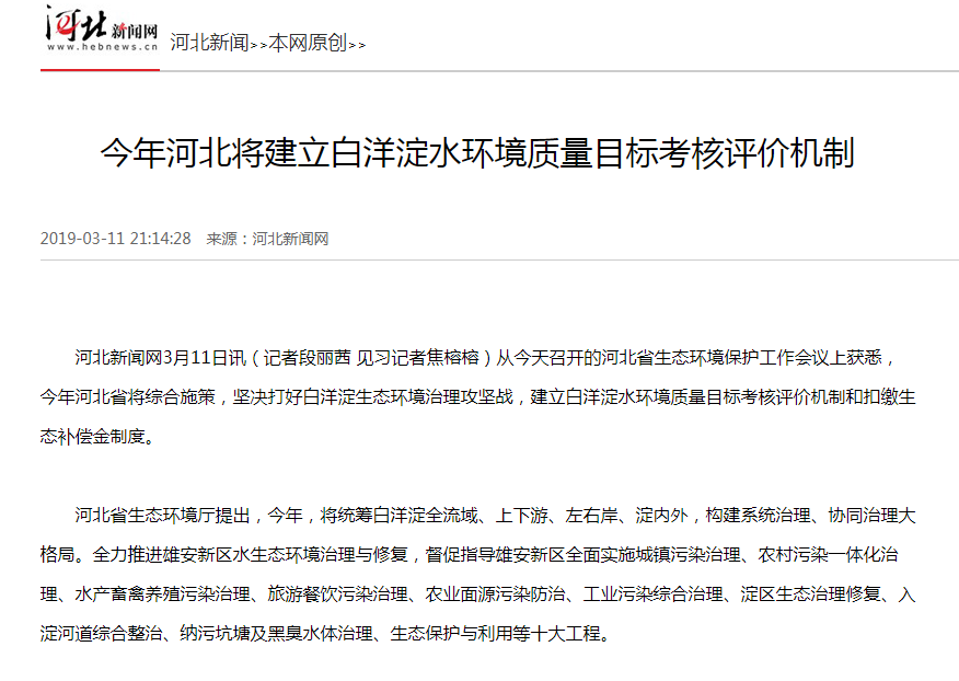 河北新闻网:今年河北将建立白洋淀水环境质量目标考核评价机制