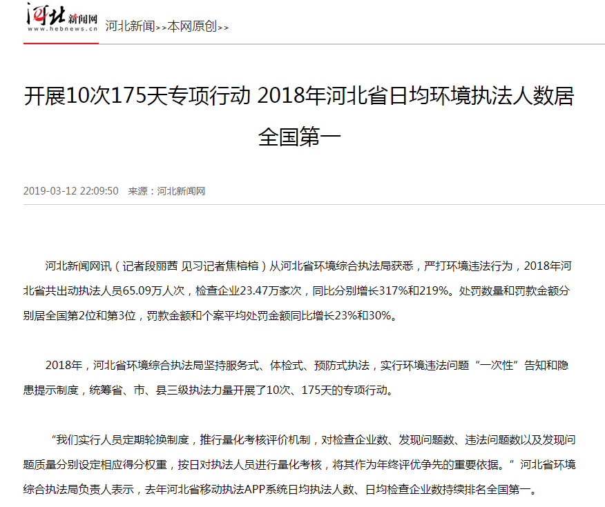 2018年,河北省环境综合执法局坚持服务式、体检式、预防式执法,实行环境违法问题“一次性”告知和隐患提示制度,统筹省、市、县三级执法力量开展了10次、175天的专项行动。