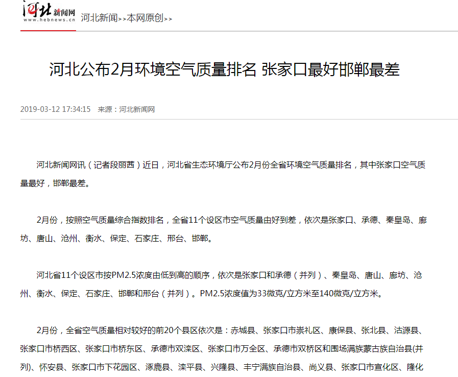 河北新闻网讯(记者段丽茜)近日,杏彩(中国)官方网站 公布2月份全省环境空气质量排名,其中张家口空气质量最好,邯郸最差。