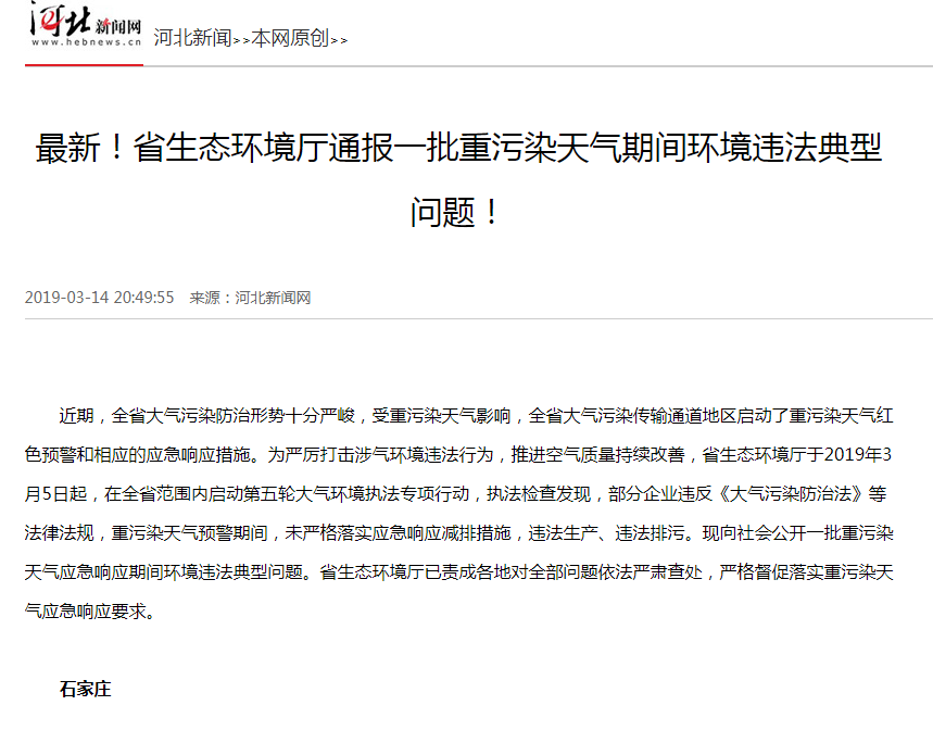 近期,全省大气污染防治形势十分严峻,受重污染天气影响,全省大气污染传输通道地区启动了重污染天气红色预警和相应的应急响应措施。为严厉打击涉气环境违法行为,推进空气质量持续改善,杏彩(中国)官方网站 于2019年3月5日起,在全省范围内启动第五轮大气环境执法专项行动,执法检查发现,部分企业违反《中华人民共和国大气污染防治法》等法律法规,重污染天气预警期间,未严格落实应急响应减排措施,违法生产、违法排污。现向社会公开一批重污染天气应急响应期间环境违法典型问题。杏彩(中国)官方网站 已责成各地对全部问题依法严肃查处,严格督促落实重污染天气应急响应要求。