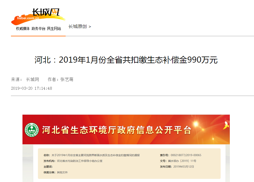 通报2019年1月份全省主要河流跨界断面水质及生态补偿金扣缴情况。图片来源于杏彩(中国)官方网站 官网截图。