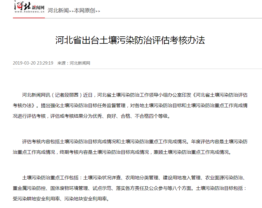 河北新闻网讯(记者段丽茜)近日,河北省土壤污染防治工作领导小组办公室印发《河北省土壤污染防治评估考核办法》。提出强化土壤污染防治目标任务监督管理,对各地土壤污染防治目标和土壤污染防治重点工作完成情况进行评估考核,评估或考核结果分为优秀、良好、合格、不合格四个等级。