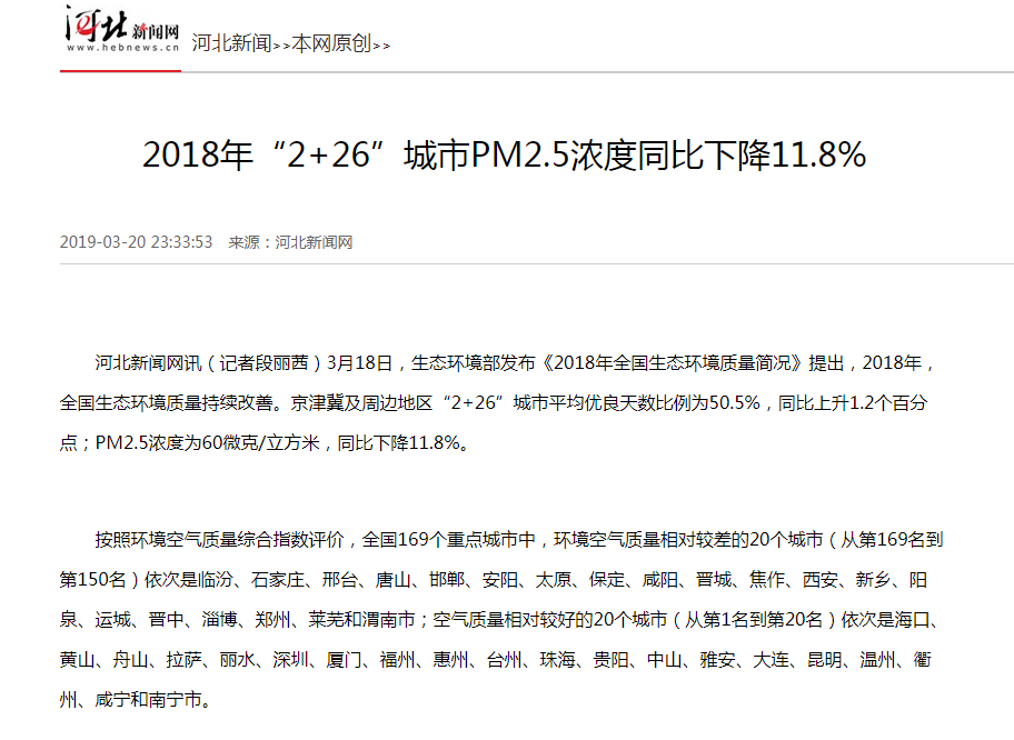 河北新闻网讯(记者段丽茜)3月18日,杏彩发布《2018年全国生态环境质量简况》提出,2018年,全国生态环境质量持续改善。京津冀及周边地区“2+26”城市平均优良天数比例为50.5%,同比上升1.2个百分点;PM2.5浓度为60微克/立方米,同比下降11.8%。