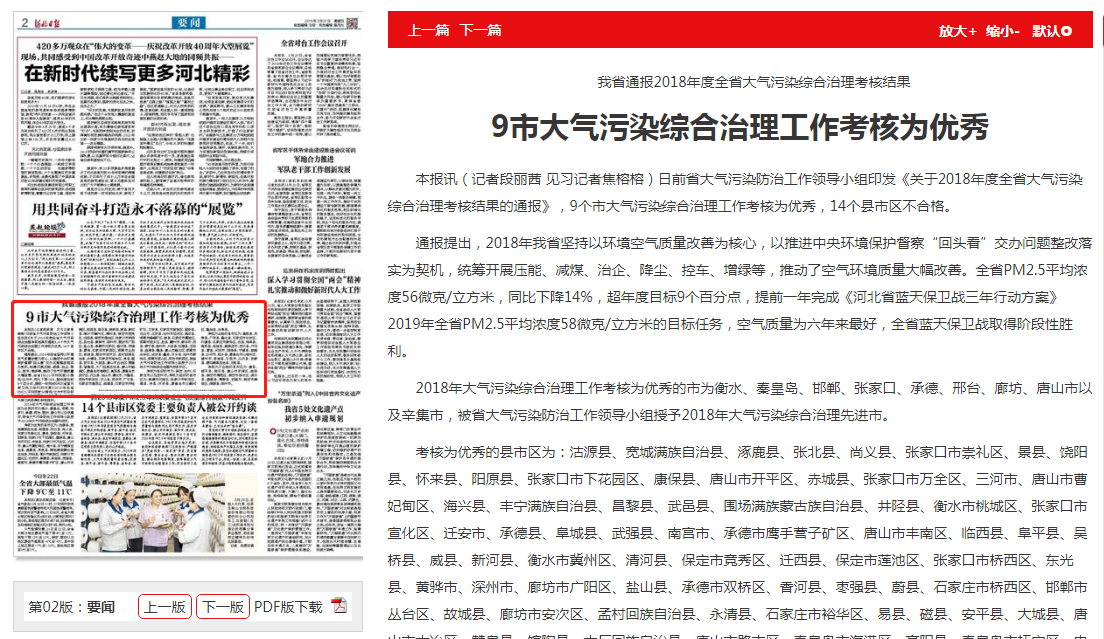 2018年大气污染综合治理工作考核为优秀的市为衡水、秦皇岛、邯郸、张家口、承德、邢台、廊坊、唐山市以及辛集市,被省大气污染防治工作领导小组授予2018年大气污染综合治理先进市。
